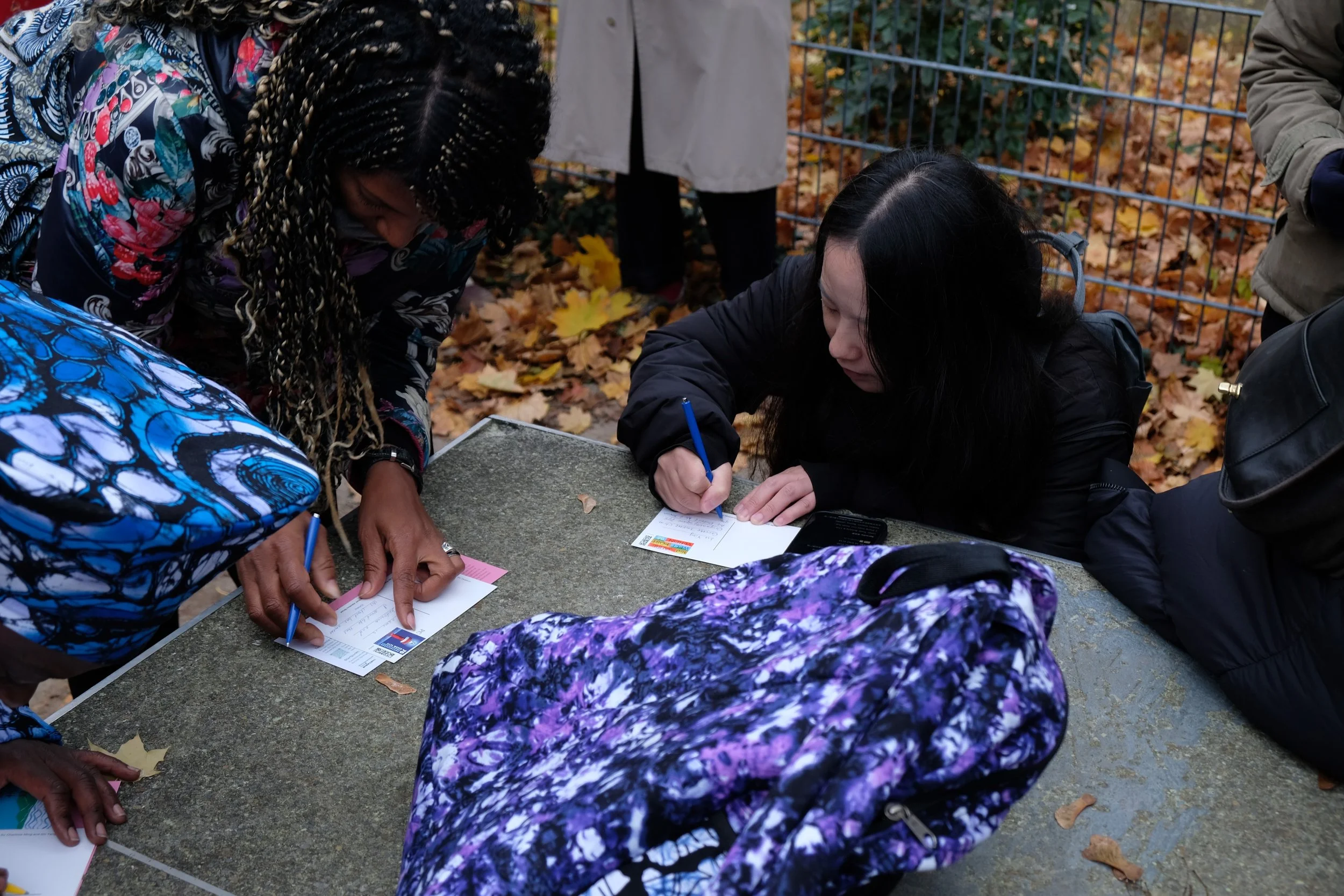 A participatory invention was staged at Pekinger Platz in Berlin, which commemorates German suppression of the Boxer Rebellion. Ming shared the history behind the surrounding street names and the colonial gaze embedded in those old postcards, and invited participants to write their own postcards reflecting on their experiences with migration and borders, which were mailed at the end of the intervention.